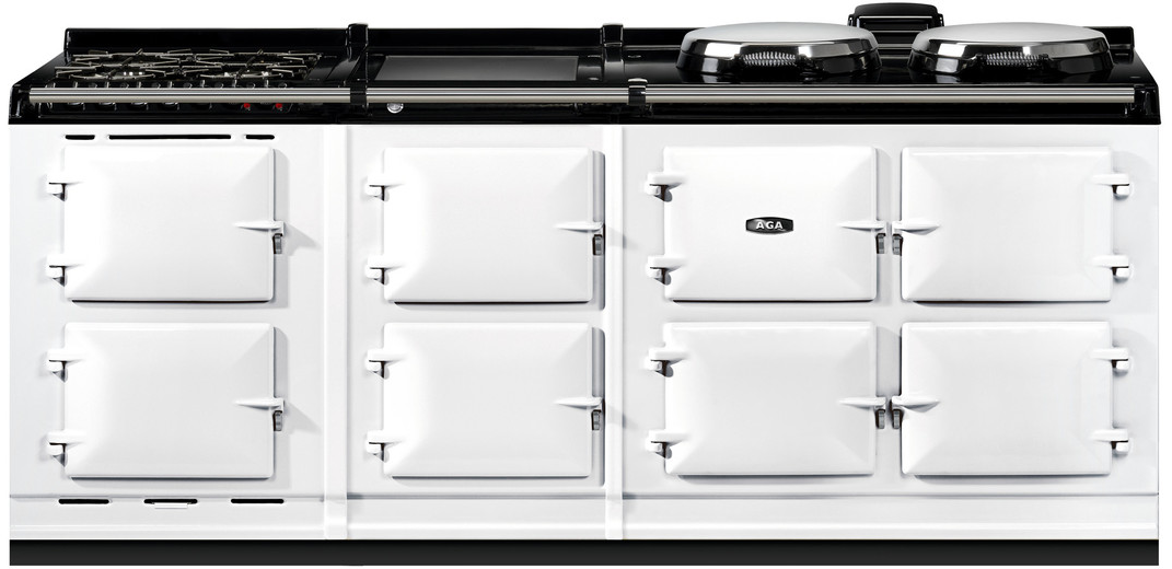 The R7 offers classic AGA styling and boasts the gleaming vitreous enamel finish which takes three days to achieve at our factory in Shropshire, England. Built and manufactured to our meticulous standards, these models feature three cast-iron ovens and two independently controlled hotplates (boiling and simmering plates), while the 150 models feature two additional ovens for slow cooking and warming, and the choice of either a warming plate or a single-zone induction cooktop.These ranges are highly detailed, from the AGA embossed cast-iron oven doors to the branded handrails and black flush fitting side panels.