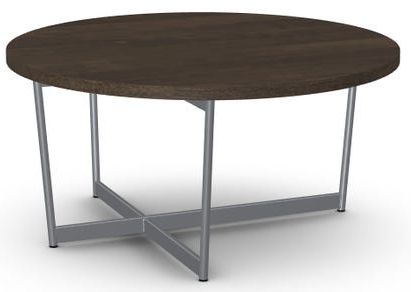The Amisco Jill Birch Veneer Coffee Table features a round, birch veneer tabletop with a flat edge and an x-shaped metal frame. Additional tabletop and colour options are available from your local dealer.