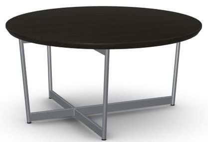 The Amisco Jill Solid Ash Coffee Table features a round, solid ash tabletop with a flat edge and an x-shaped metal frame. Additional tabletop and colour options are available from your local dealer.