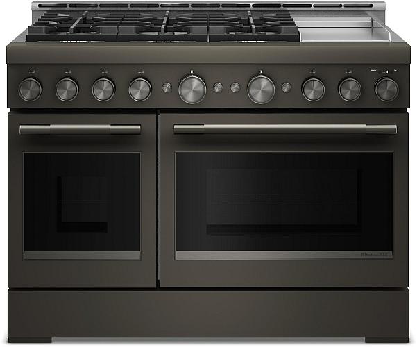 Satisfy your craving to create with a 48-inch KitchenAid® Commercial-Style Range with Chrome Electric Griddle. This 6-burner gas range features two versatile 20,000 BTU Ultra Power™ Dual-Flame Burners with the power and precision to successfully sear, simmer, stir-fry and sauté. The double oven with Even-Heat™ True Convection gives consistent baking and roasting, plus air fry mode that yields crispy, golden results.Read More