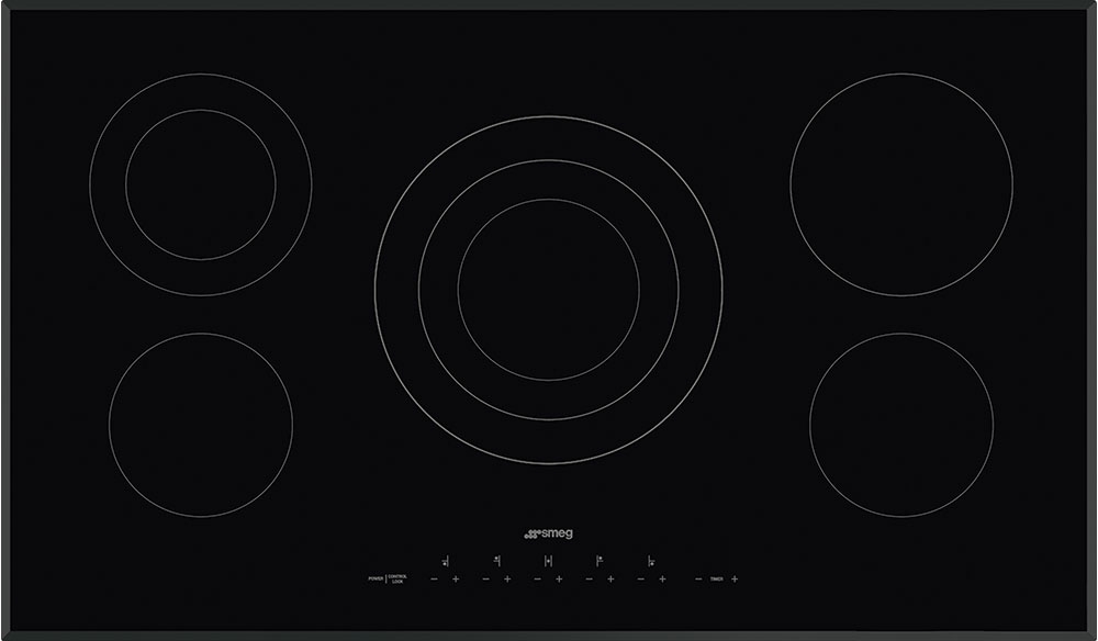 Smeg 36" black ceramic cooktop featuring 5 cooking zones and soft touch controls.Read More